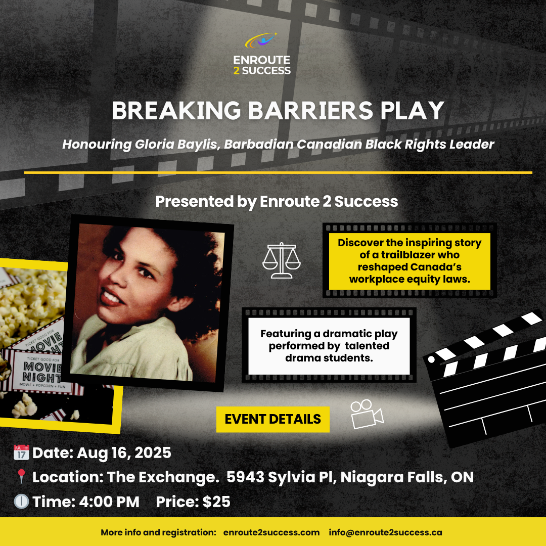 Join Enroute 2 Success for an inspiring evening as we celebrate by honouring the legacy of Gloria Baylis, a Barbadian-Canadian trailblazer whose groundbreaking victory in Canada’s first workplace racial discrimination case reshaped equity laws and opened doors for countless others.
