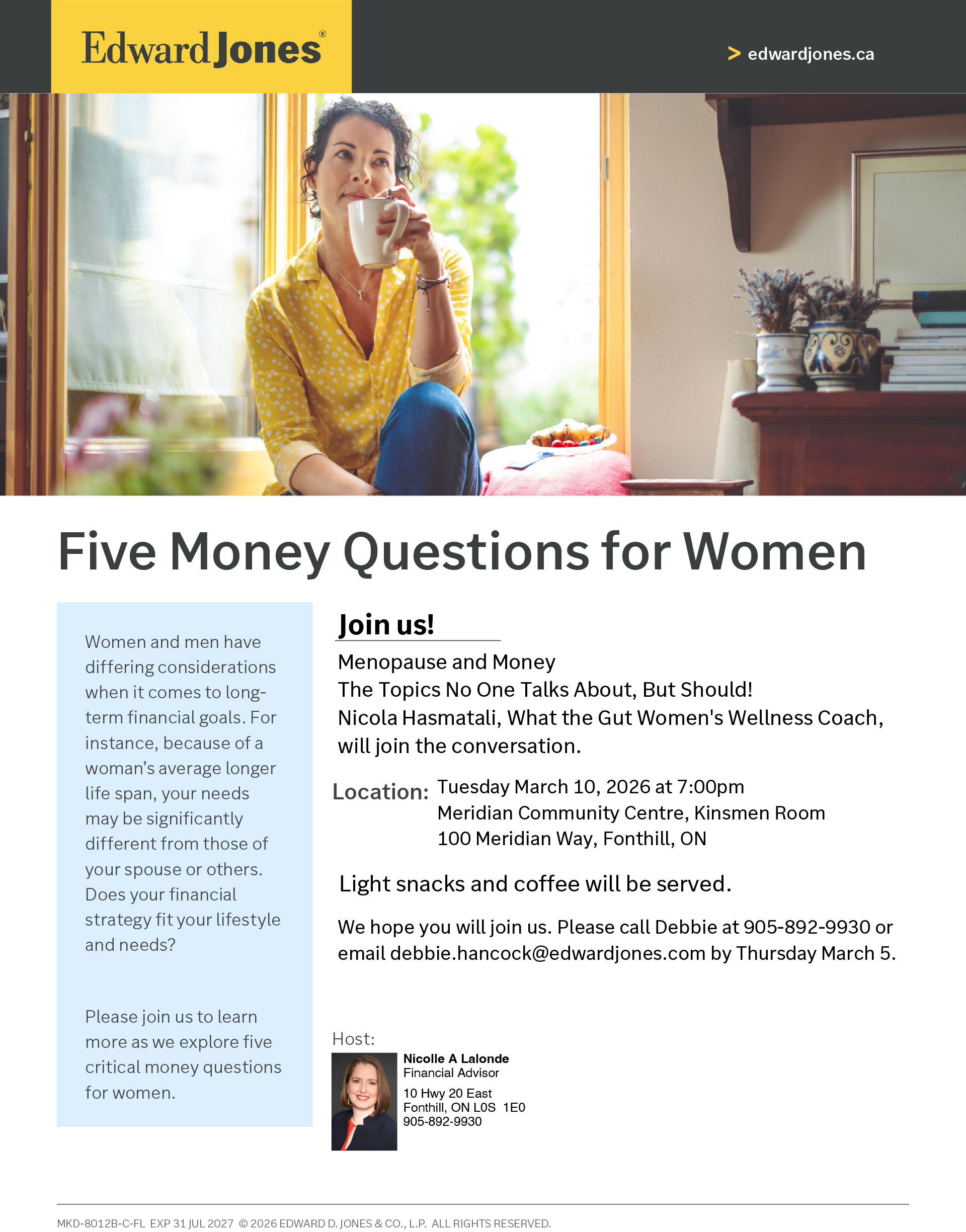Join us for Menopause and Money – The Topics No One Talks About But Should! Complimentary seminar hosted by Edward Jones Financial Advisor, Nicolle Lalonde. Nicola Hasmatali, What the Gut Women’s Wellness Coach, will join the conversation on Tues. March 10 at the Meridian Community Centre in Fonthill, ON at 7pm. To RSVP, please call Debbie at 905-892-9930 or via email [email protected] by Thurs. March 5.