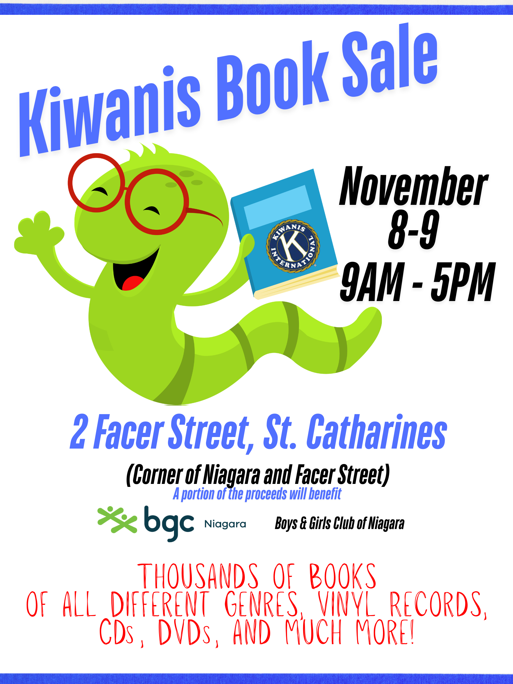 The Kiwanis Club of St. Catharines, a not-for-profit organization raising funds for children in the city, will be holding a fundraiser book sale on November 8 and 9 from 9 am to 5 pm at the Boys & Girls Club of Niagara at 2 Facer Street. Thousands of books of all different genres, vinyl records, CDs, DVDs and much more will be available for purchase with a portion of the proceeds going to BGC Niagara.
